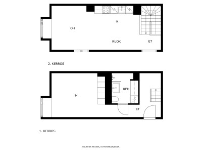 Asunnossa on kaksi kerrosta, yläkerrassa avara ja valoisa olohuone/ruokailutila, moderni avokeittiö - makuuhuone, kph/wc sijaitsevat alakerrassa.