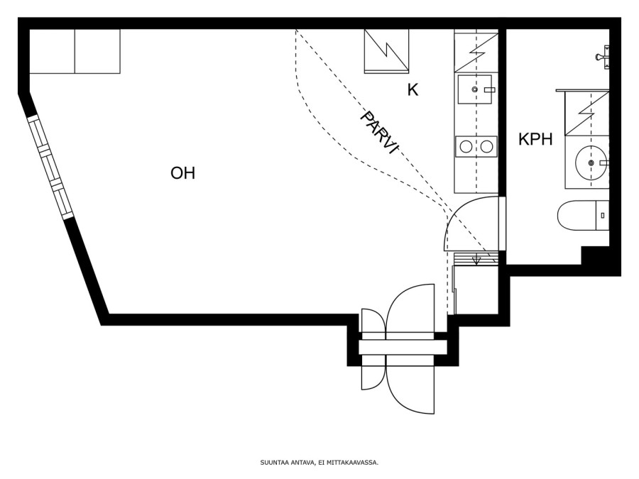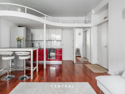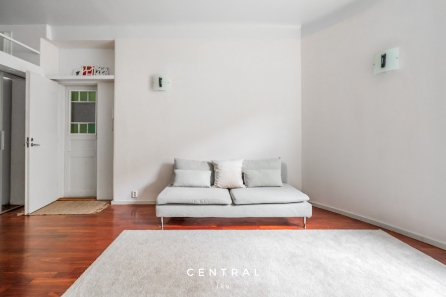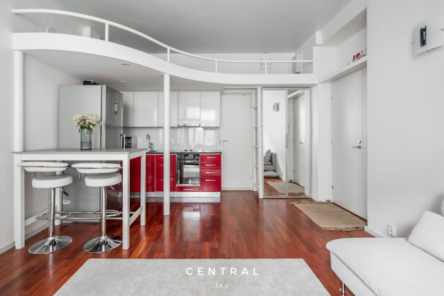 Offered for long term rent, an unfurnished studio with open plan kitchen and loft. Bathroom with shower and washing mashine included. Excellent location nearby the Kamppi Metro station.