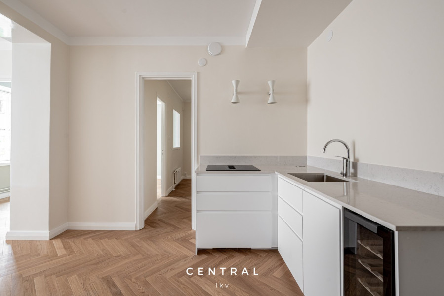 Keittiön kuvaus | Täysin uusittu keittiö. Induktioliesi, jossa imutuuletin, viinikaappi ja kvartsikomposiittitasot. |
