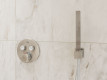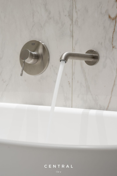 Kylpyhuoneen kuvaus-Seinät: LPC Aventura lasitettu posliinilaatta 60x60, 04L Crema -Lattia: LPC Aventura lasitettu posliinimosaiikki 5x5, 04 Crema, tasapintainen matta, leikattu lasikuituverkolla 30x30 -Kylpyamme: Balteco Danube kiviamme 154x71x65 cm, valkoinen -GROHE-hana