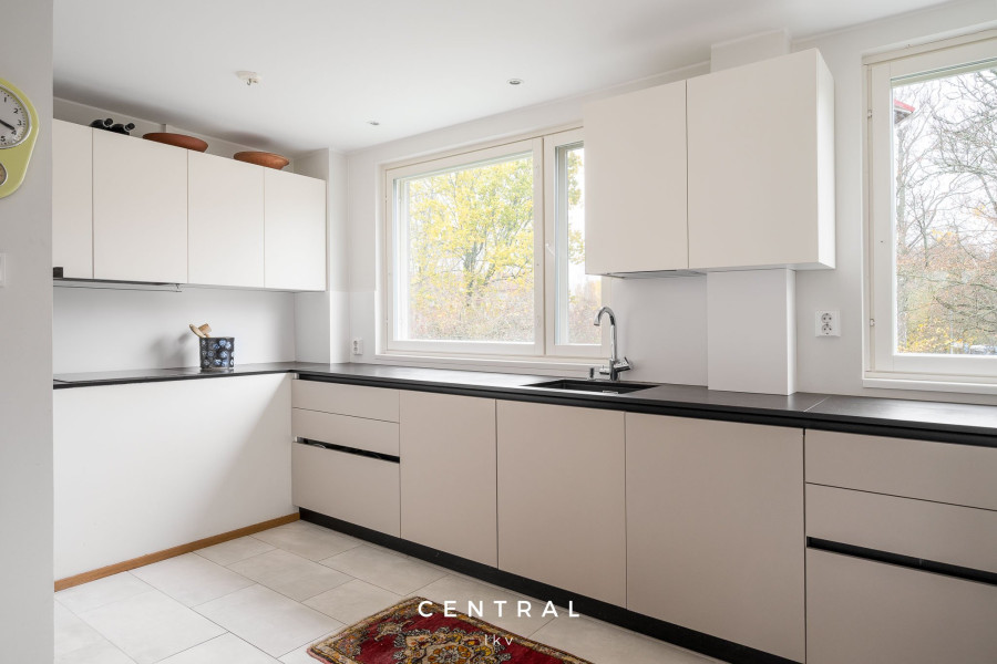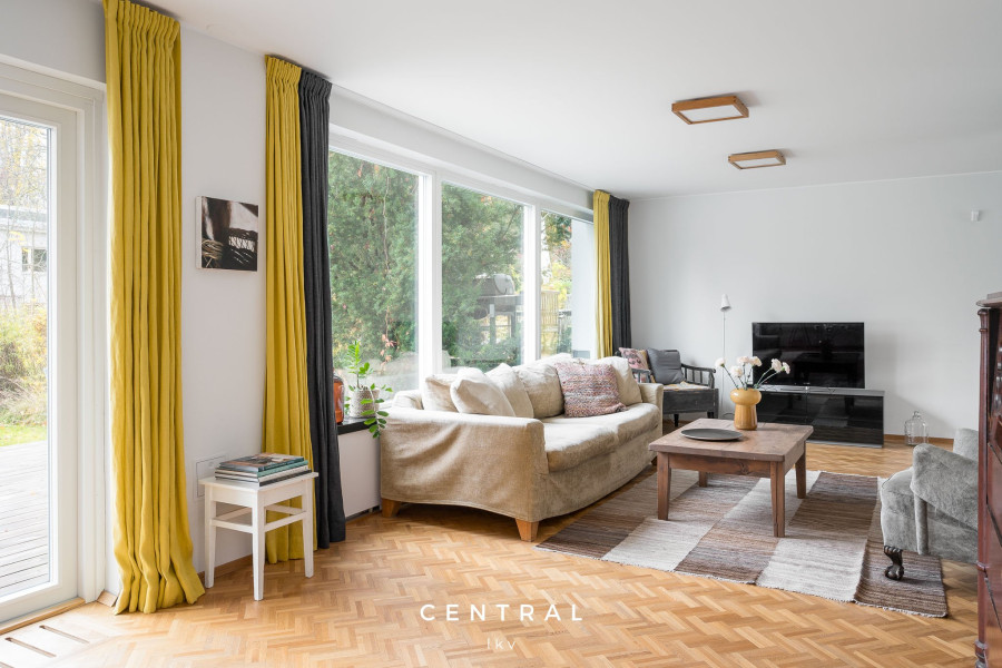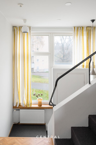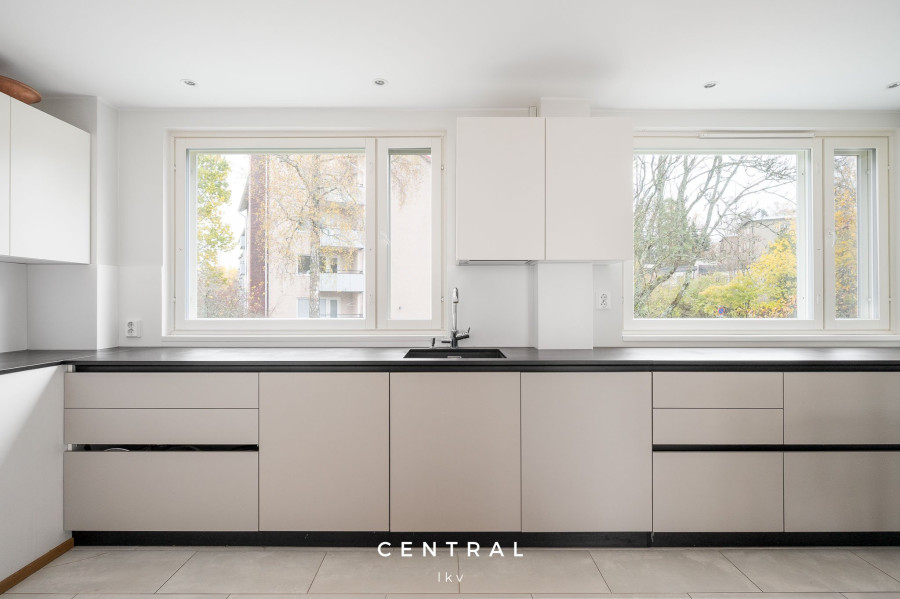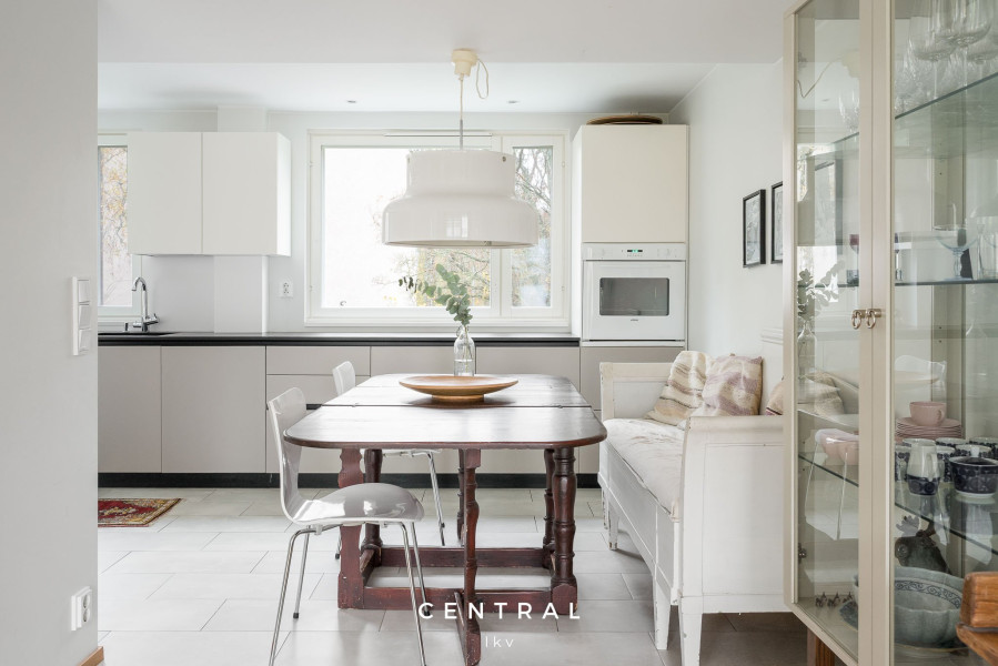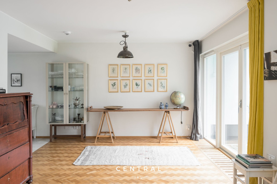 | Olohuoneen kuvaus | Avara ja valoisa olohuone, jossa isot ikkunapinnat omalle suojaisalle ja vehreälle sisäpihalle, jossa myös terassi. |