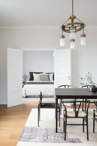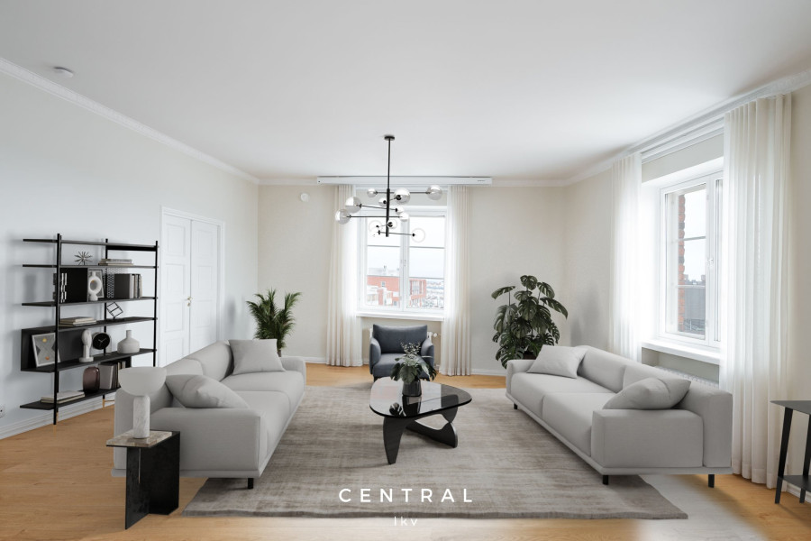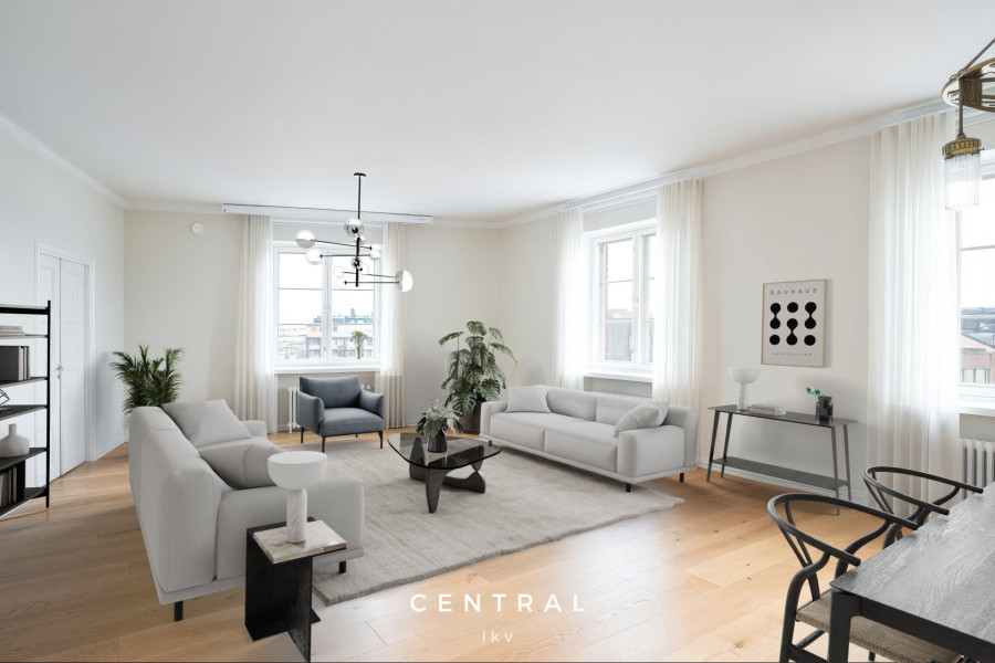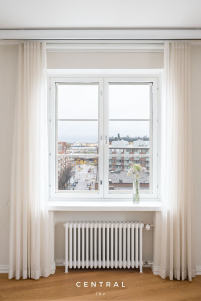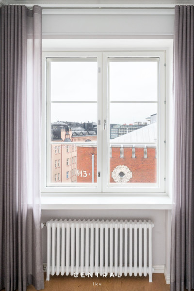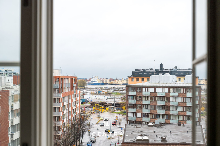 Denna luftiga och ljusa lägenhet i husbolagets sjunde och översta våning bjuder på fantastiska vyer i tre väderstreck. Från vardagsrummet sträcker sig utsikten över Kronbergsfjärden ända till Utrikesministeriet på Skatudden samt mot ståtliga Helsingfors domkyrka som syns ovanför hustaken.