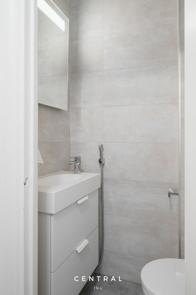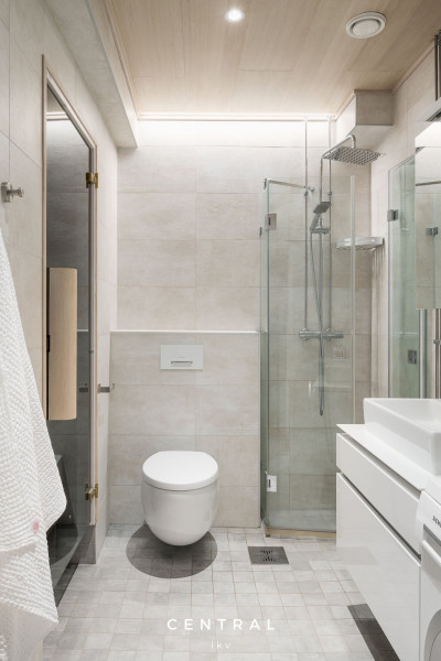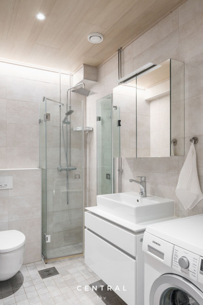 Kylpyhuoneen kuvausTyylikkäästi kauttaaltaan v. 2019 uusittu ja laatoitettu kylpyhuone. Kalusteet Villeroy & Boch. Suihku, jossa taitettava lasiseinä, allaskaluste, peilikaappi. Seinä wc. Kaunis valaistus ja rauhallinen värimaailma. Lattialämmitys.