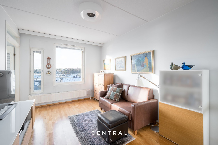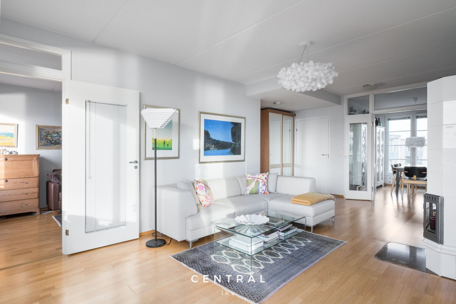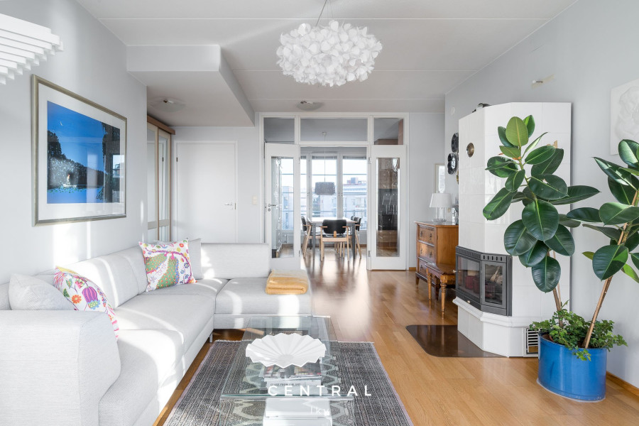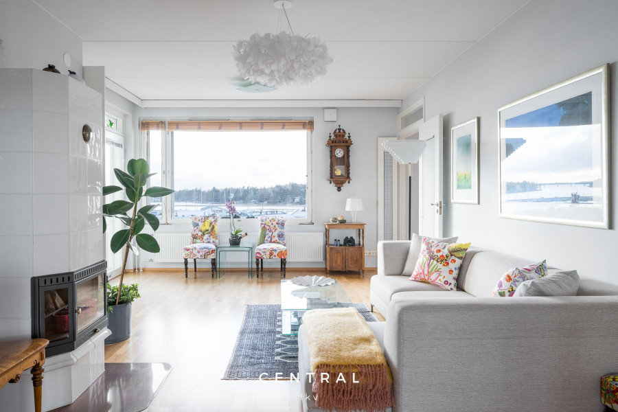 Olohuoneen kuvausKauniissa olohuoneessa toimiva takka ja käynti lasitetulle parvekkeelle. Isoista ikkunoista ja parvekkeelta, avarat näkymät kattojen yli merelle. Huoneistossa kaikkialla parkettilattiat.