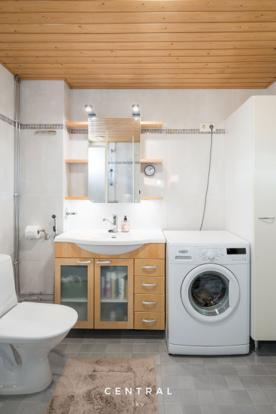 Kylpyhuoneen kuvausLaatoitetussa ja kaakeloidussa kylpyhuoneessa wc, allaskaappi, peilikaappi, erillinen pystykaappi, suihku, suihkuseinät, pesukoneliitäntä, ikkunallinen sauna, jossa Harvia jatkuvalämmitteinen kiuas.