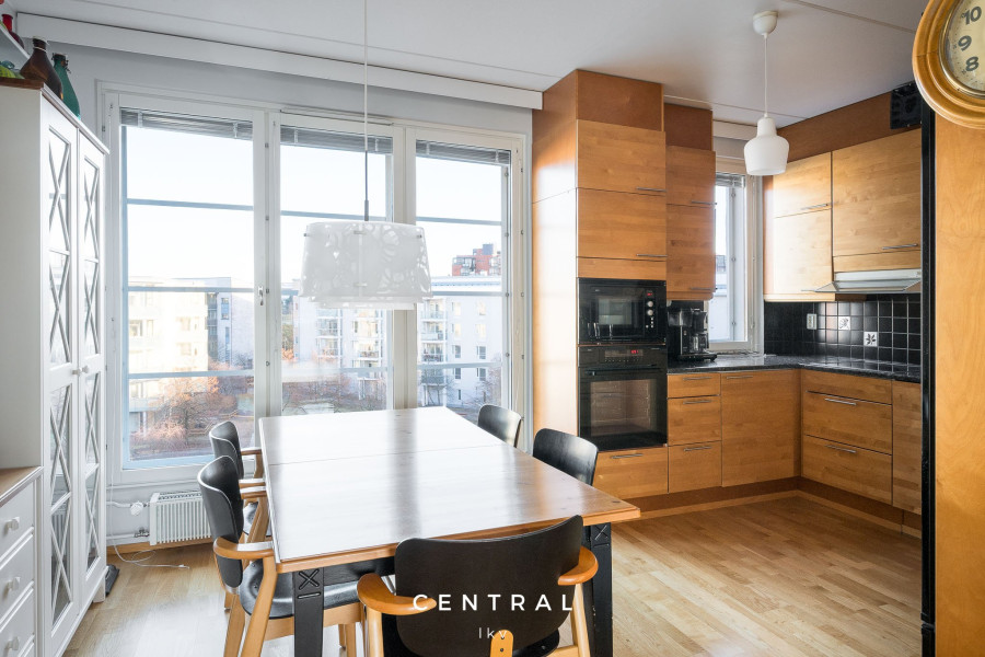 Keittiön kuvausHyvänkokoinen keittiö, jossa paljon kaapistoja, iso ikkuna sisäpihan puolelle ja tilaa ruokapöydälle. Keittiössä pystyjääkaappi/pakastin, astianpesukone, liesitaso, liesituuletin, erillinen uuni ja mikro. Kivitasot ja parkettilattia. Keittiön kaapistot alkuperäisiä ja ovat hieman ajan saatossa kuluuneet pinnoiltaan.