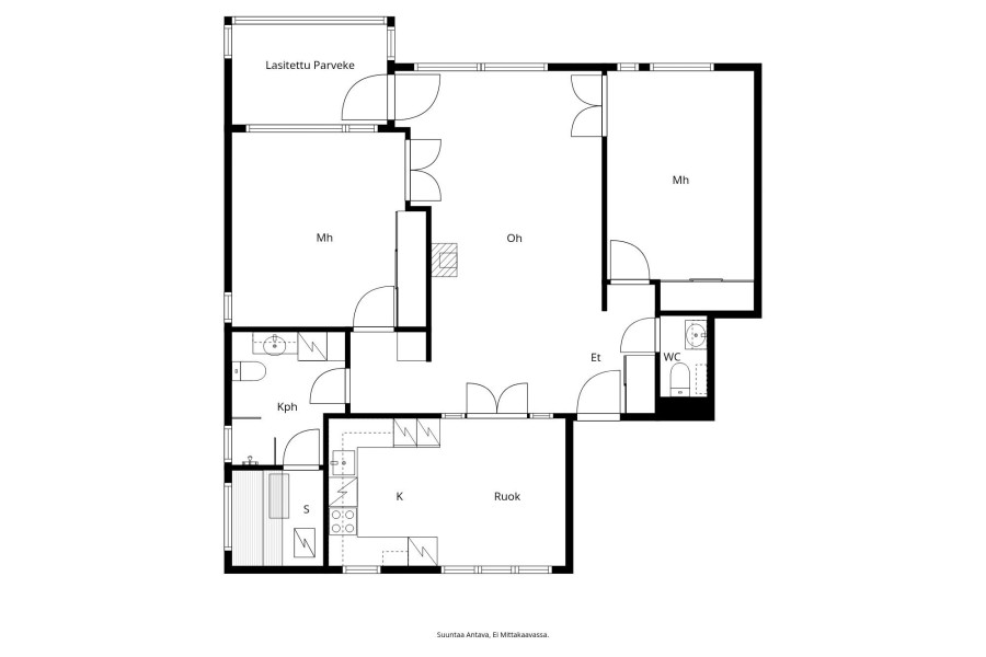 Huoneiston kokoonpano3h, k, kph, sauna, erill.wc, lasitettu parveke