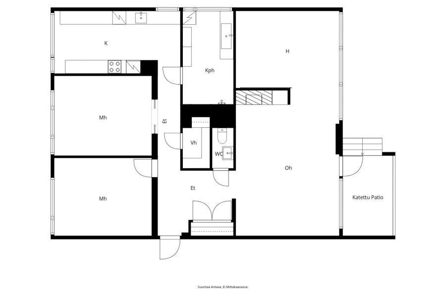 | Huoneiston kokoonpano | 2 mh, oh, k, kph, wc, rt, vh, et, terassiparveke |