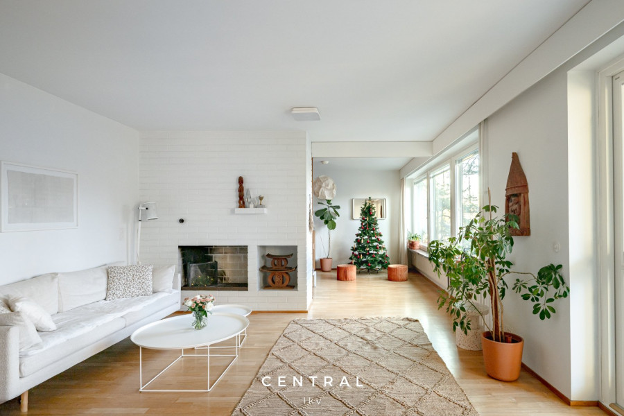 Olohuoneen yhteydessä on tunnelmallinen takka, olohuoneesta käynti terassiparvekkeelle ja piha-alueelle, josta avautuvat upeat näkymät Ramsayn rannan yli Munkkiniemen venesatamaan ja merelle. Olohuoneen yhteydessä ruokasali, josta avarat näkymät.