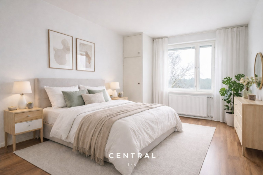 Makuuhuoneen kuvausMakuuhuoneessa säilytystilana alkuperäisiä komeroita. Kaikkialla laminaattilattiat, seinät maalattu, eteisessä tapettia.