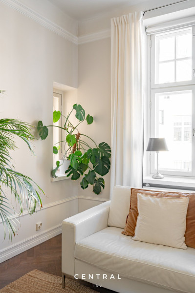 Ylimmän kerroksen kauniisti laitettu läpitalon kaksio. Avarat huoneet ja mukavasti valoa ja ilmavuutta. Laadukas, ajaton keittiö jossa on tilaa ruokapöydälle. Makuuhuone sijaitsee taloyhtiön sisäpihan puolella, jossa kauniit avarat ja vehreät näkymät länteen. Taloyhtiö on liittynyt kaukokylmään, mikä lisää ihanasti asuinmukavuutta kesähelteillä. Perinteisellä menetelmällä toteutettu linjasaneeraus v. 2019, yhtiöllä vuokratuloja.