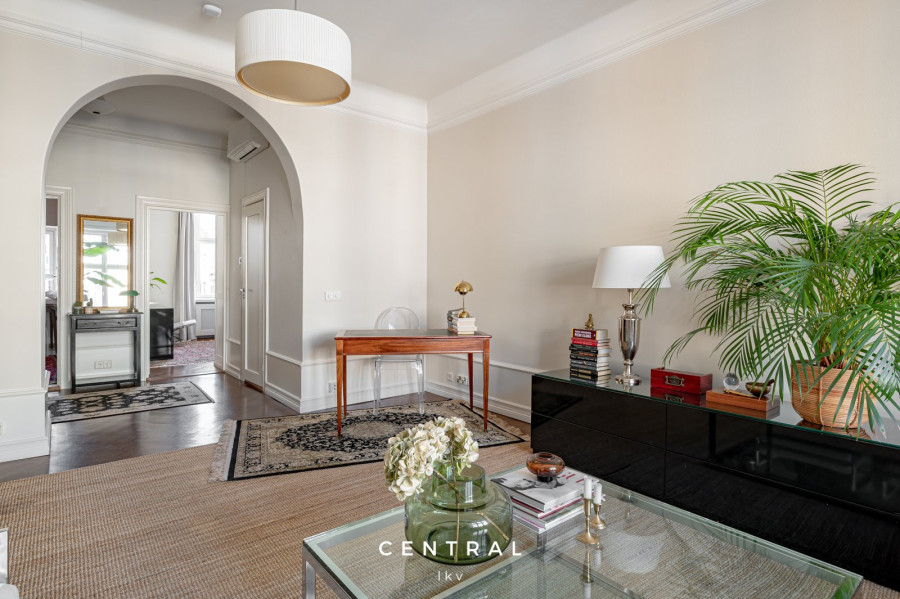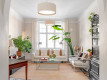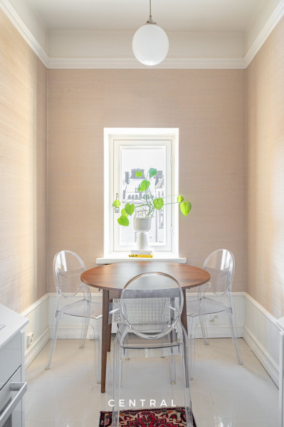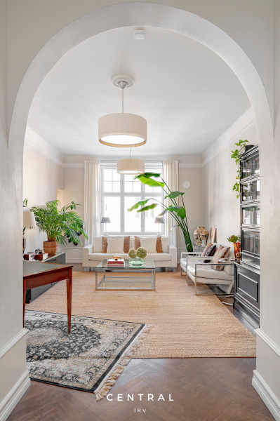 | Olohuoneen kuvaus | Tilava olohuone isolla ikkunalla, josta näkymät Huvilakadulle päin. Lattia kaunis tumma kalanruotoparketti. |