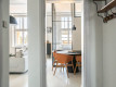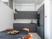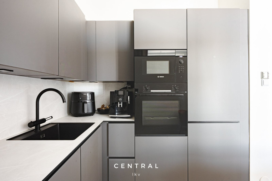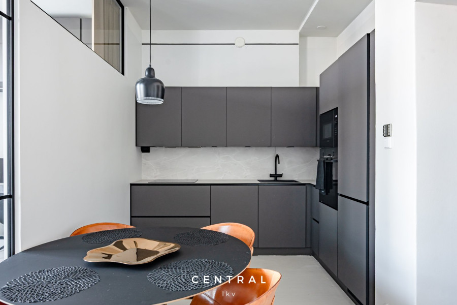 Keittiö on varusteltu modernisti ja tyylikkäästi, ja sen tummanharmaat integroidut kodinkoneet sulautuvat saumattomasti kokonaisuuteen. Olohuoneen yhteydessä on myös alumiinilasiseinin varusteltu työhuone, joka toimii myös toisena makuuhuoneena.