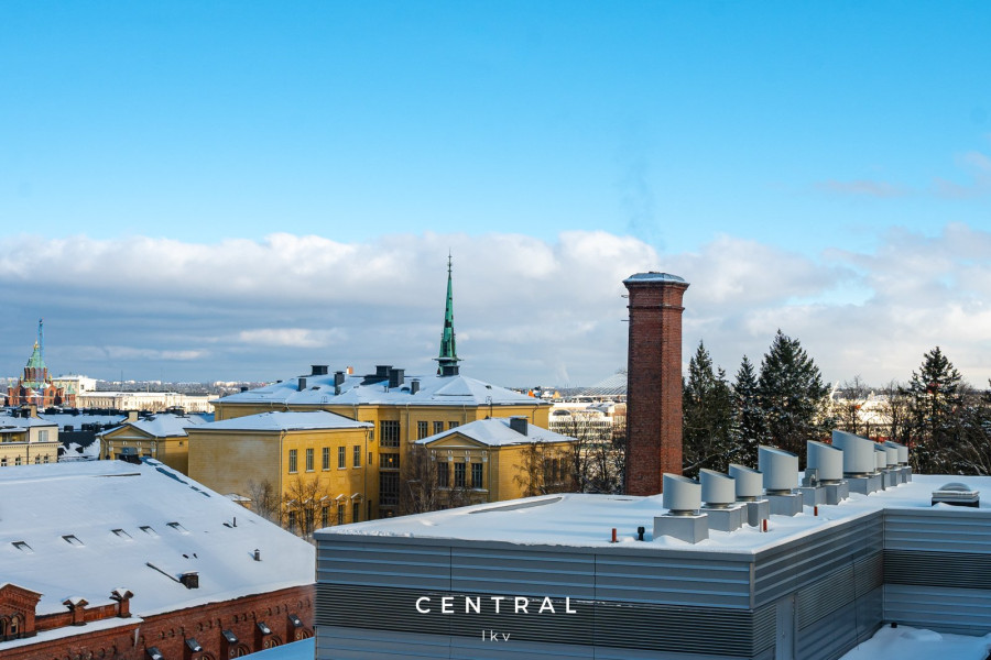 Arvokiinteistössä sijaitsevan asunnon olohuoneesta, keittiöstä ja toisesta makuuhuoneesta avautuvat avarat näkymät Eteläsataman suuntaan, aina merelle asti.