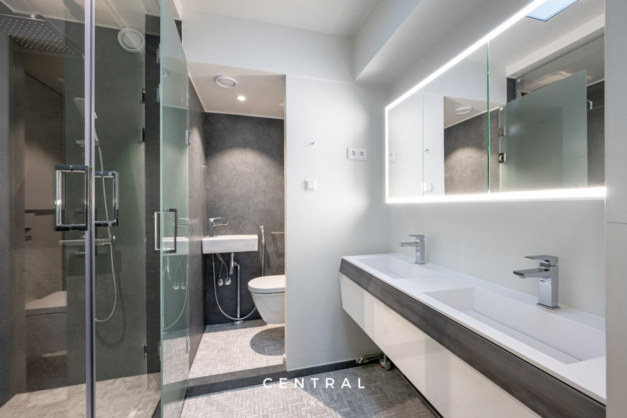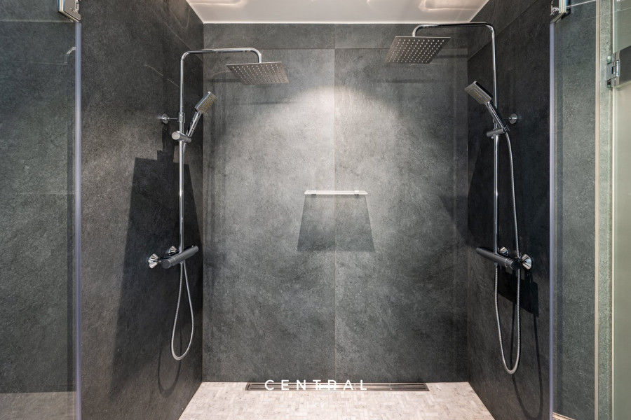 | Kylpyhuoneen kuvaus | Yläkerrassa master bedroomin yhteydessä kph/wc ja alakerrassa sauna/uima-allasosaston yhteydessä iso kph. Alakerran tilava kylpyhuonetila avautuu uima-allasosastolle, 2 suihkua. Alakerran tiloja voisi kuvailla tasokaaksi kylpylä-alueeksi |