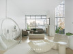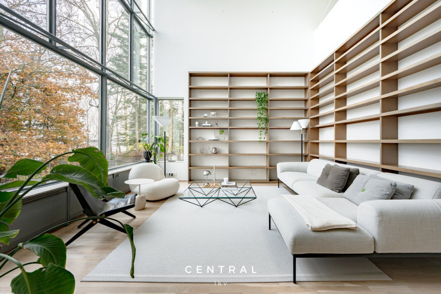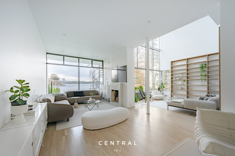 Valoisa olohuone ja korkeat huoneet luovat avaran ja ilmavan tunnelman.