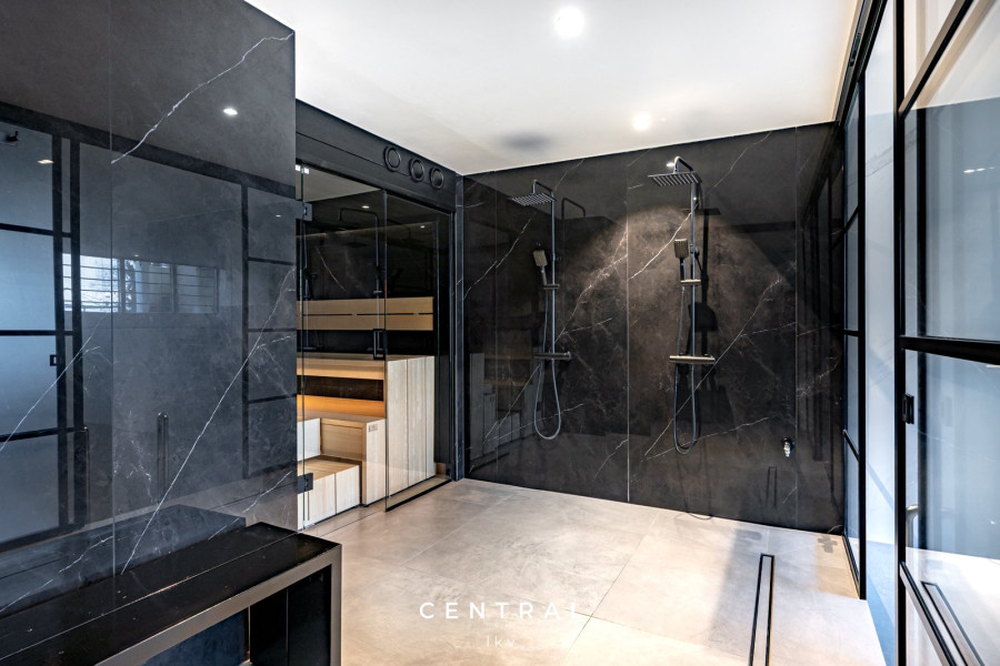 Alakerran upea sauna- ja uima-allasosasto kutsuu rentoutumaan ja hemmottelemaan itseään.