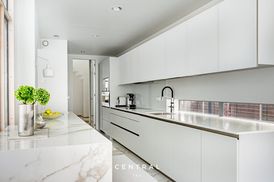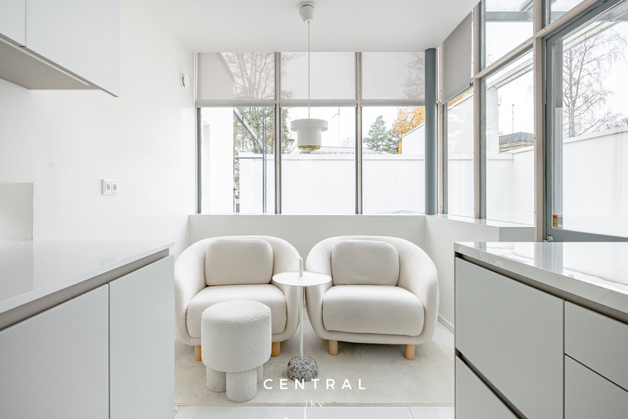 | Keittiön kuvaus | Tasokkaasti varusteltu Snaidero-keittiö, josta kulku ruokasaliin ja terassille. Gaggenau-kodinkoneet, kivitasot. runsaasti kaappi- ja työskentelytilaa. Keittiössä tilaa "arkiruokapöydälle". |