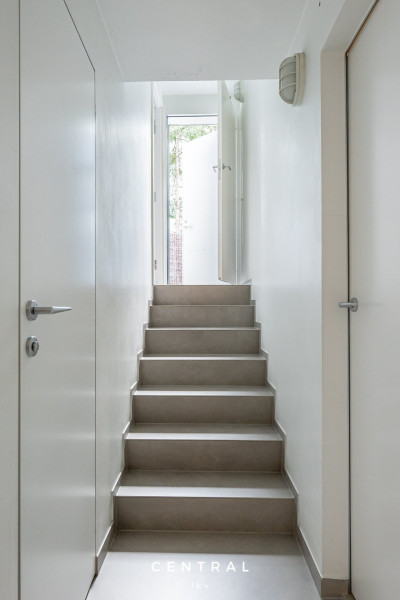 -myös käynti masterbedroomin parvekkeelta kierreportaita pitkin merenrantapihalle
