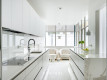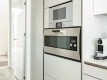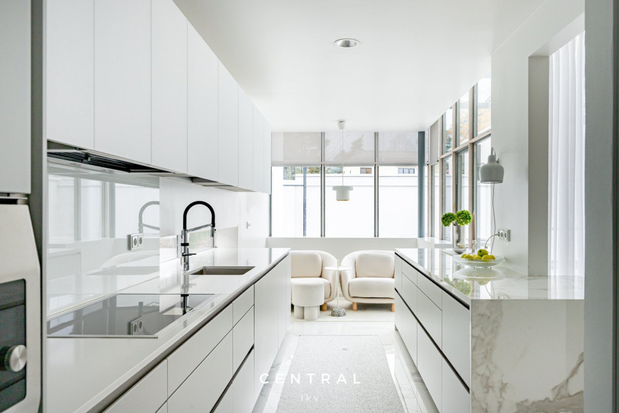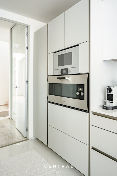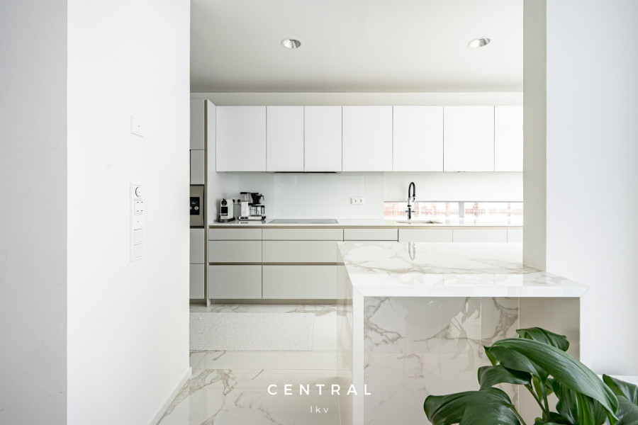 Asunnon laadukkaasti varusteltu Snaidero-keittiö, jossa on Gaggenau-kodinkoneet ja kivitasot, avautuu ruokasaliin ja suojaiselle terassille.