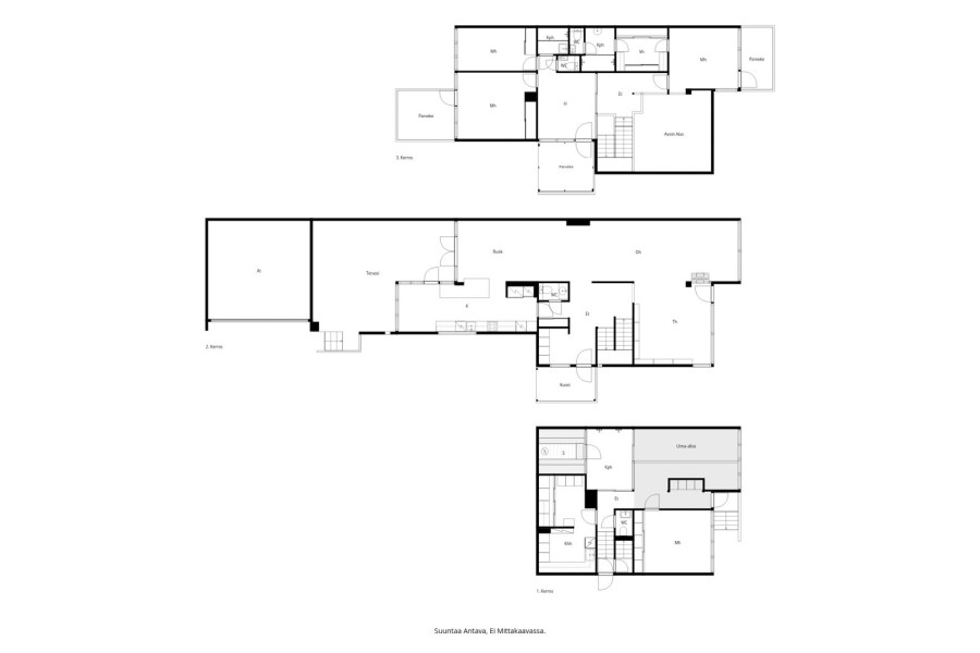 | WC:n kuvaus | Jokaisessa kolmessa kerroksessa erilliset wc:t, huoneiden yhteydessä ja molempien sisäänkäyntien(sekä tulotasossa että alakerrassa) yhteydessä |