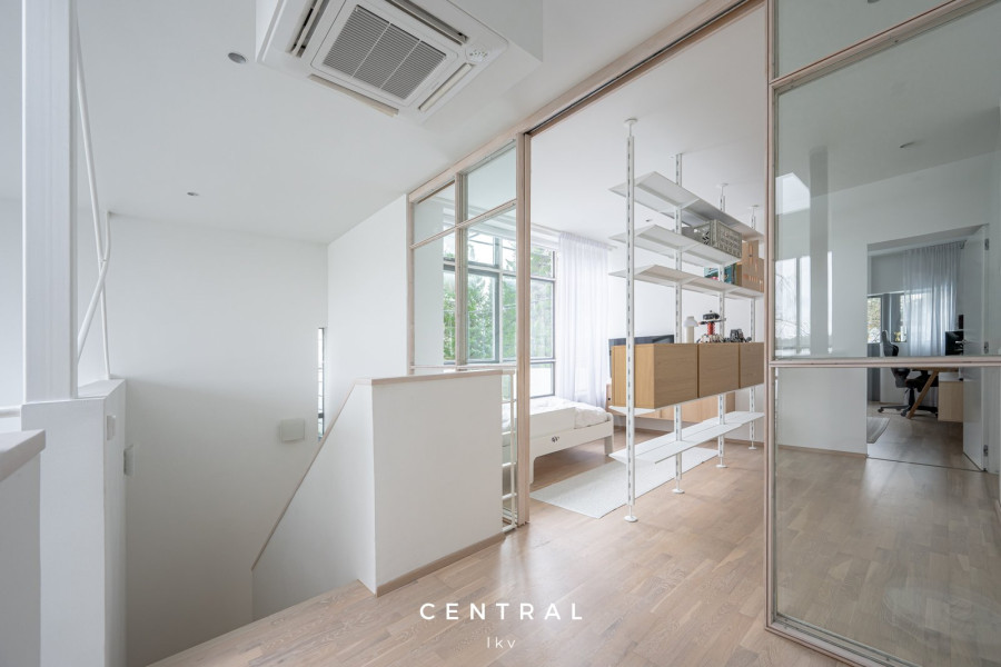 På övre våningen finns tre sovrum som erbjuder rofyllda utrymmen för familjen, och från sovrummet på nedre våningen finns direkt utgång till den egna innergården.