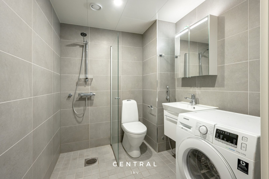 Tilavassa kylpyhuoneessa on pesukoneliitäntä ja modernit kalusteet.