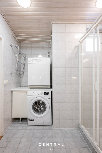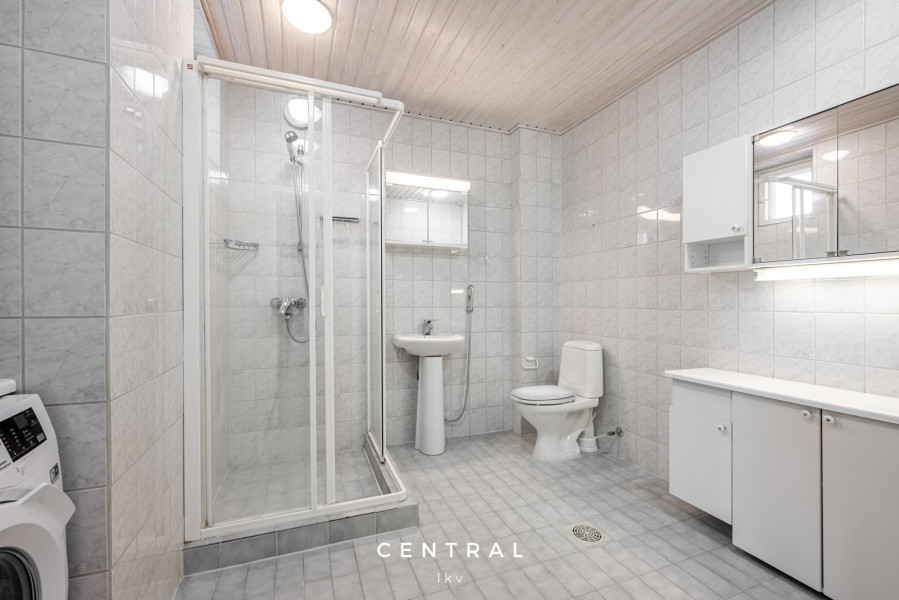 Kylpyhuoneen kuvaus | Tilava kylpyhuone jossa tilaa pesutornille. |