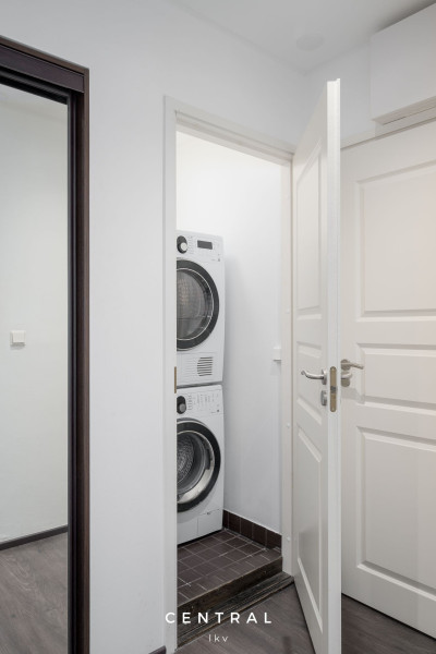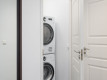 Kodinhoitohuoneen kuvausKomeroon rakennettu kodinhoitotila, jossa pesukoneliitäntä ja tilaa pesutornille, lattiakaivo.