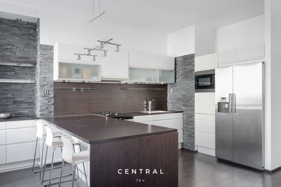 Keittiön kuvausTilava avokeittiö jossa runsaasti lasku- ja kaappitilaa. Saarekeosassa tilaa baarijakkaroille.