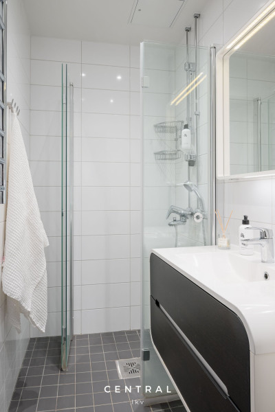 Kylpyhuoneen kuvausVuonna 2018-2020 suoritetun LVIS-remontin yhteydessä uusittu erillinen kylpyhuone suihkulla.
