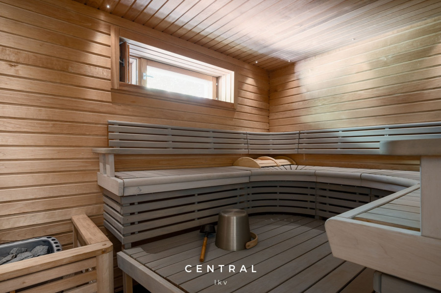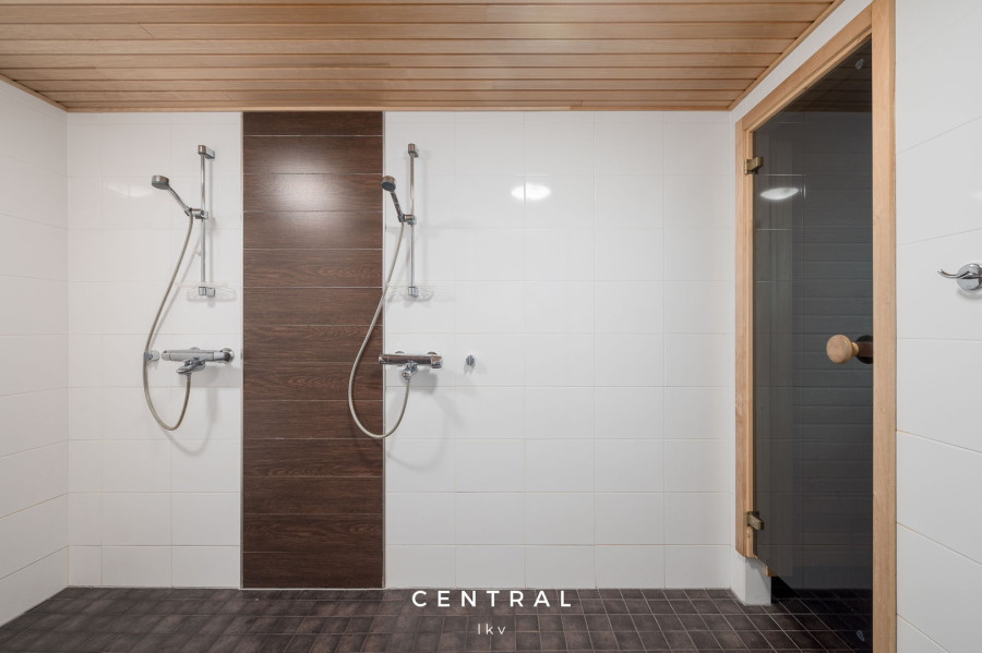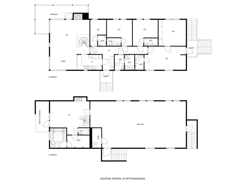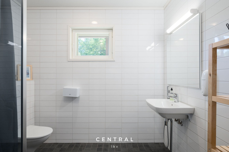 Sokkelikerros: (55 + 105 m²): Sauna, suihkutilat ja WC, oleskelutila takalla, lämmitettävä varastotila (100 m², soveltuu myös kokoontumistilaksi), tekninentila