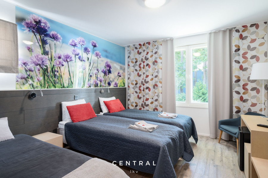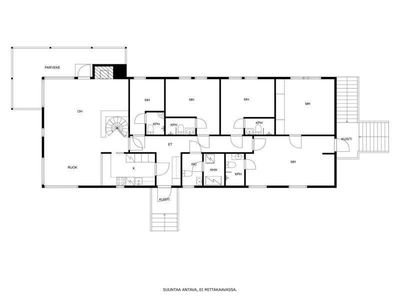 Asuintilat: Asuinkerros (160 m²): 1 kahden huoneen perheyksikkö (2+2 hlö) omalla suihkulla/WC:llä, 2 kahden hengen huonetta omilla suihkuilla/WC:llä, 1 yhden hengen huone omalla suihkulla/WC:llä, erillinen inva-WC, tekninen tila/pesutupa, moderni keittiö, ruokailu- ja oleskelutila takalla sekä järvinäköalaterassi.