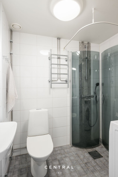 Kylpyhuoneen varustetaso | WC-istuin, suihku, suihkuseinä, pesukoneliitäntä, lattialämmitys, peilikaappi, peili ja allaskaappi |