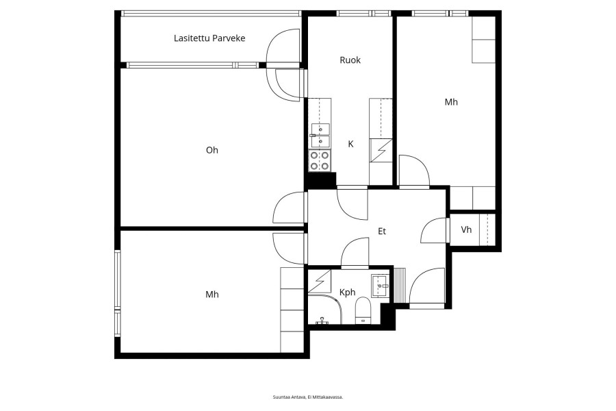 Huoneiston kokoonpano | 3h, k, kph/wc, vh, parveke |