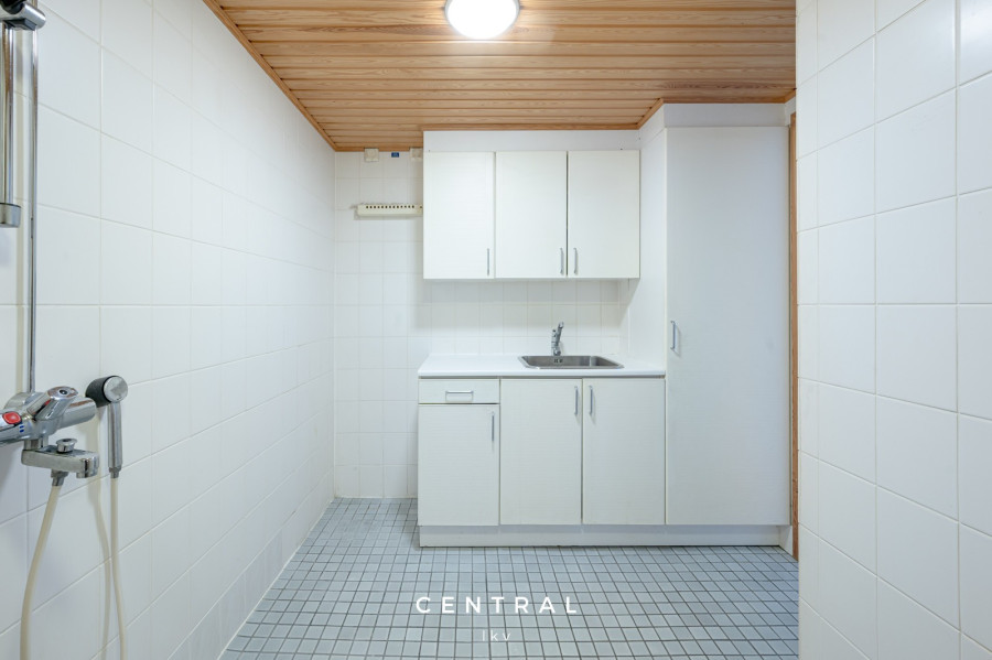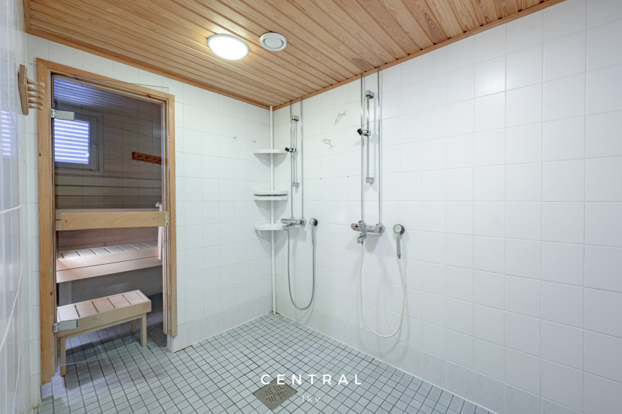 Kylpyhuoneen kuvaus | Tilava kylpyhuone, jossa kodinhoitotila, 2 suihkua |