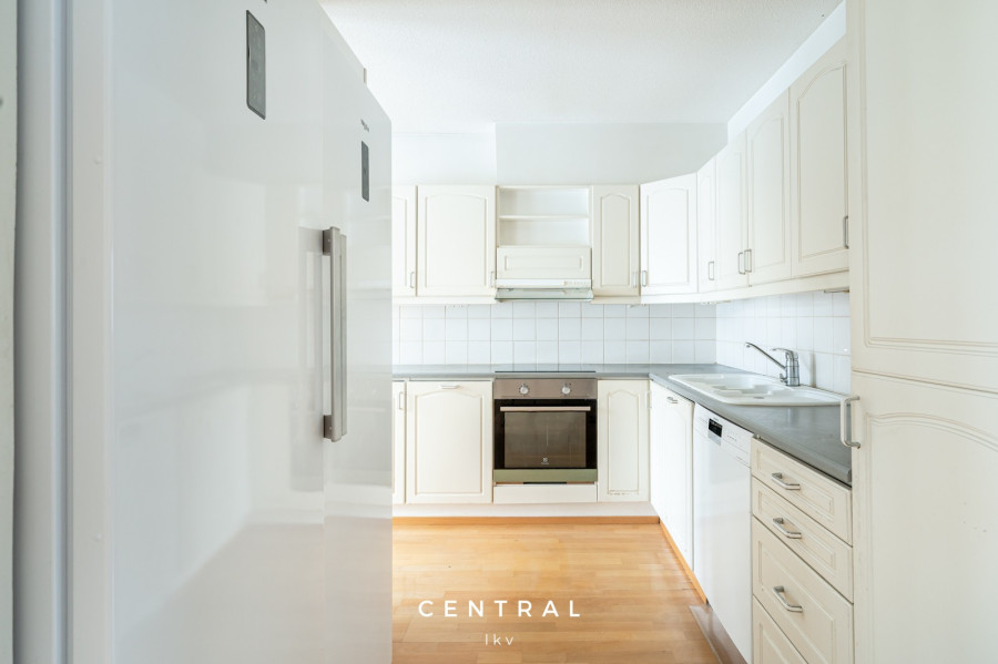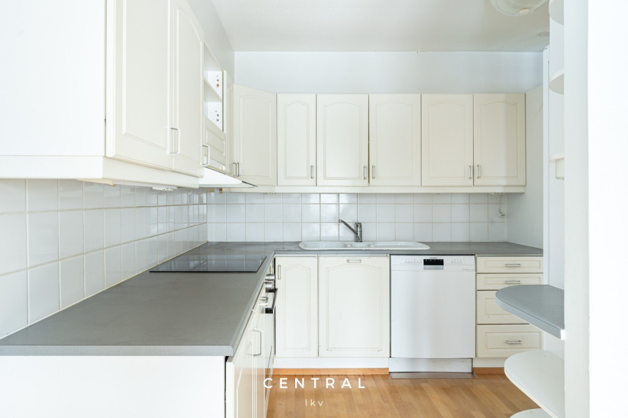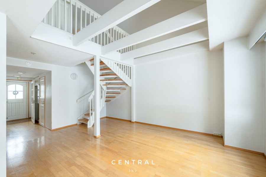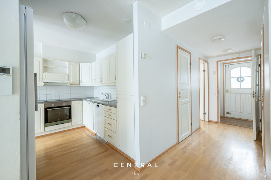 Kaksitasoinen päätyhuoneisto tarjoaa mukavat sisäpihanäkymät ja oman piha-alueen. Asunnon alakerrassa on avara olohuone, joka avautuu valoisalle sisäpihalle, sekä ruokailutila ja keittiö, jossa on kaikki tarvittavat kodinkoneet.