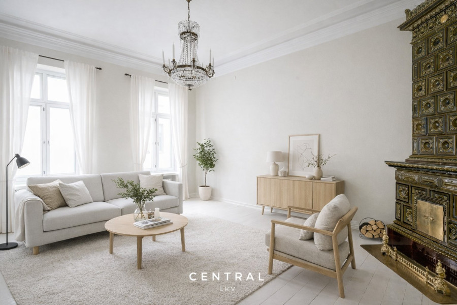 Huoneistossa on vaaleaksi maalatut lautalattiat sekä hulppea huonekorkeus. Olohuoneessa historiallisen kaunis Rörstrandin kakluuni, joka tuo tähän huoneistoon arvokasta tunnelmaa.