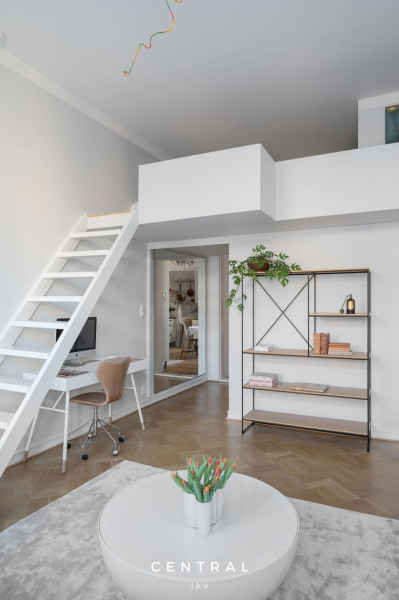 Huoneisto on läpitalon, mikä tekee siitä erityisen valoisan ja avaran. Korkeat huoneet ja suuret ikkunat luovat upeita luonnonvalon hetkiä. Ikkunallisessa keittiössä on tilavat kaapistot ja työtasot. Olohuoneessa on tilava vaatehuone sekä paikka työpisteelle. Tilava kylpyhuone on varustettu suihkulla, wc-istuimella, kylpyhuonekalusteilla ja pesukonepaikalla. Lisäksi asunnossa on tilava parvi, joka tuo lisätilaa asumiseen.