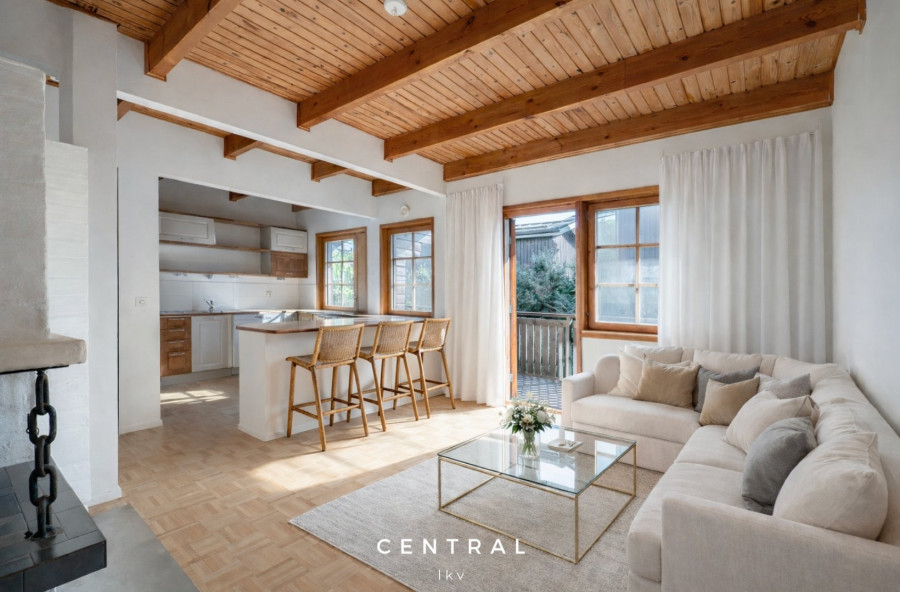 | Keittiön kuvaus | Saareke erottaa keittiön olohuoneesta, jossa takka. |