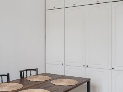 Makuuhuoneessa on riittävästi kaappitilaa ja erillinen vaatehuone, mikä tekee arjesta sujuvaa. Keittiö, joka avautuu rauhalliselle sisäpihalle, on varustettu modernilla kodinkoneilla ja tarjoaa tilaa yhteisille aterioille.