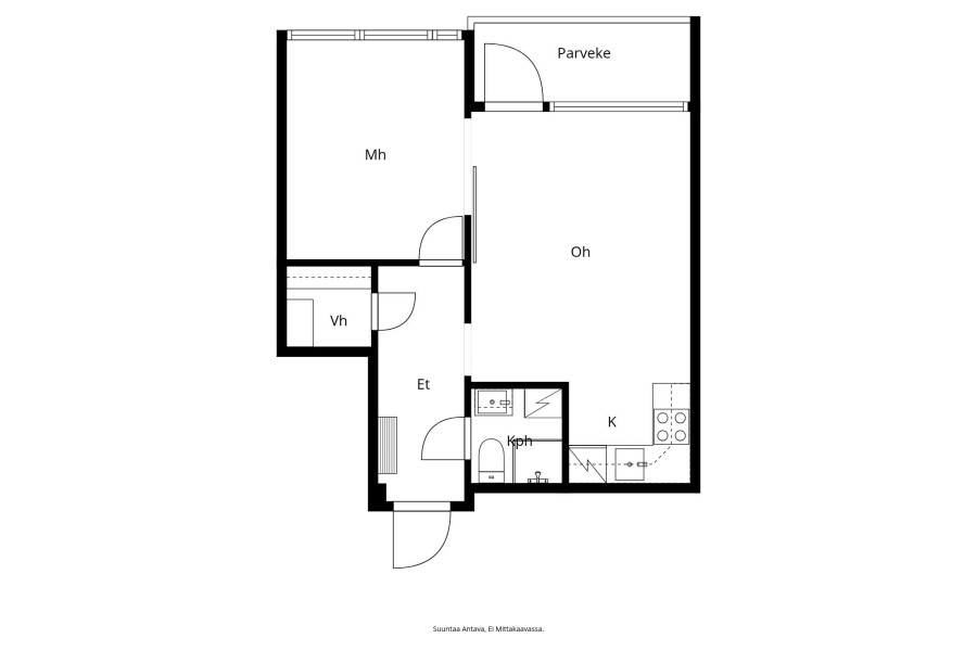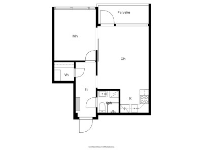 Keittiö kaipaa pientä päivitystä. Kaapistojen ovet kuluneet ja sähköliesi on jo nähnyt aikaa. Asunnon lattiat parkettia, jotka ovat hyvin säilyneet. Saat olohuoneeseen halutessasi mahtumaan myös kunnon ruokapöydän.