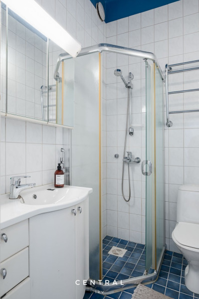 Kylpyhuoneen varustetaso | WC-istuin, suihku, allaskaappi, pesuallas, pesukoneliitäntä, suihkuseinä, peilikaappi ja pyyhekuivain |