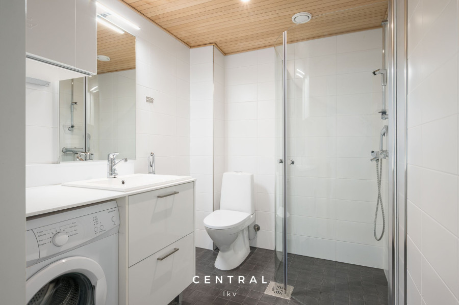 Kylpyhuoneen kuvaus | Tilava suihkullinen kylpyhuone jossa pesukone. |
