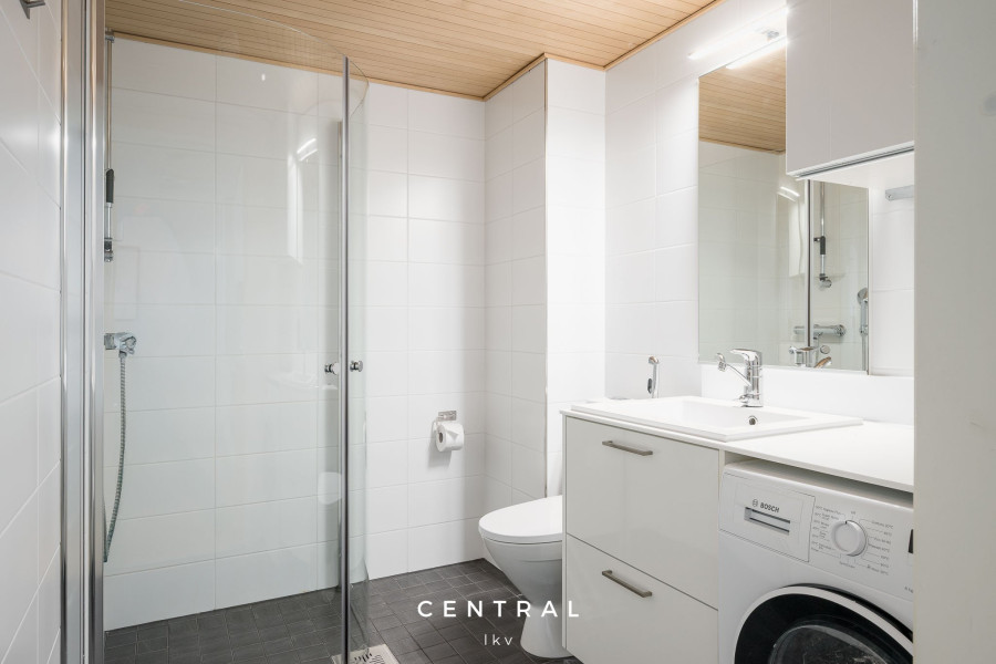 Kylpyhuoneen kuvaus | Tilava kylpyhuone jossa pesukone, |