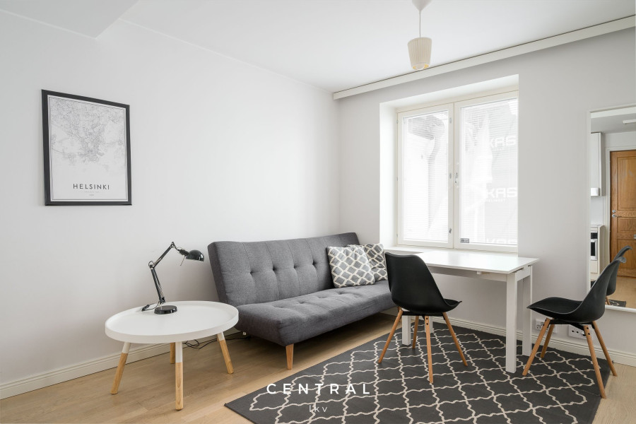 Väldisponerad och funktionell tvåa i gott skick på paradplats i Helsingfors, alldeles invid Gamla Kyrkan. Bostaden ligger i tystnaden av den anrika, år 1890 byggda fastighetens innergård. Välförsett öppet kök och rymligt, fräscht badrum med dusch och tvättmaskin. Bostaden hyrs omöblerad eller möblerad enligt överenskommelse. Husbolaget har bastu, tvättstuga och gym.
