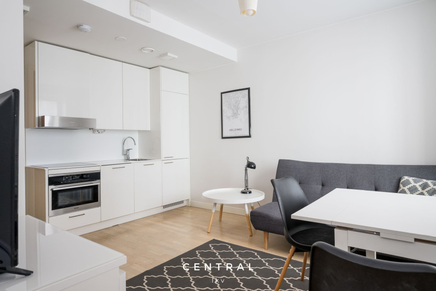 Olohuoneen kuvaus | Olohuoneen yhteydessä avokeittiö, ikkuna rauhalliselle sisäpihalle. Vuokraan kuuluu asunnossa olevat kalusteet. |