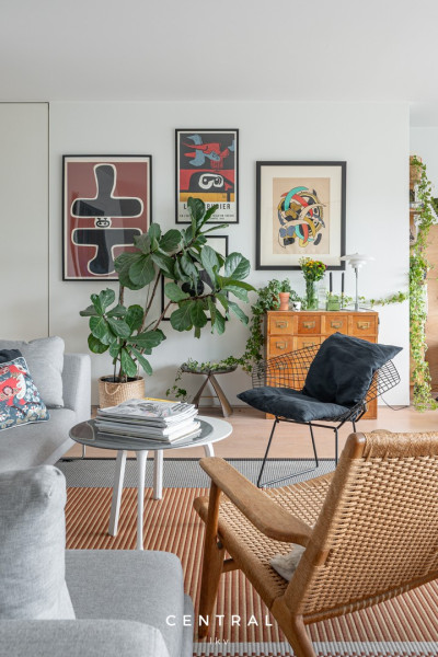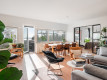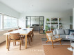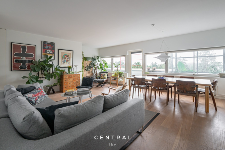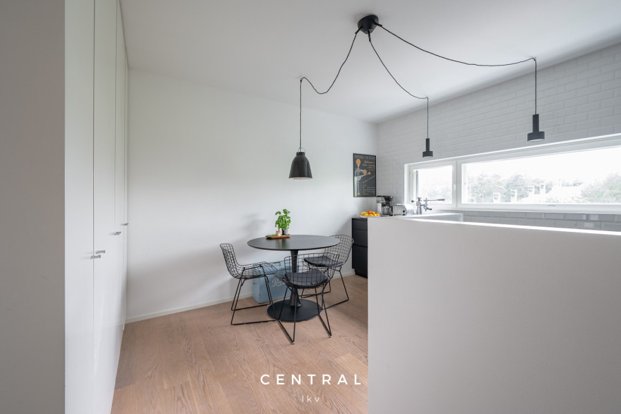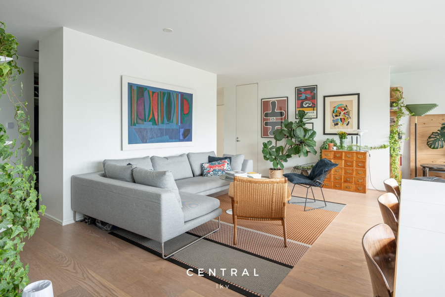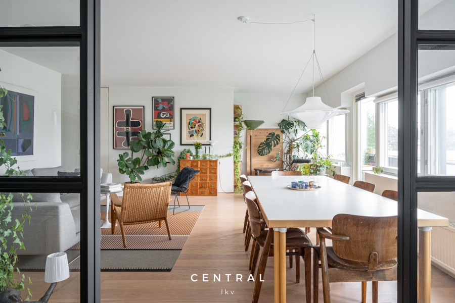 Olohuoneen kuvausAvara olohuone jonne mahtuu niin sohvaryhmä kun isompi ruokapöytä. Kulku isolle terassille
