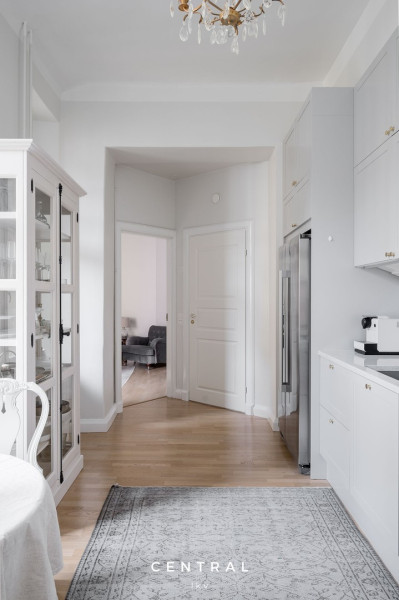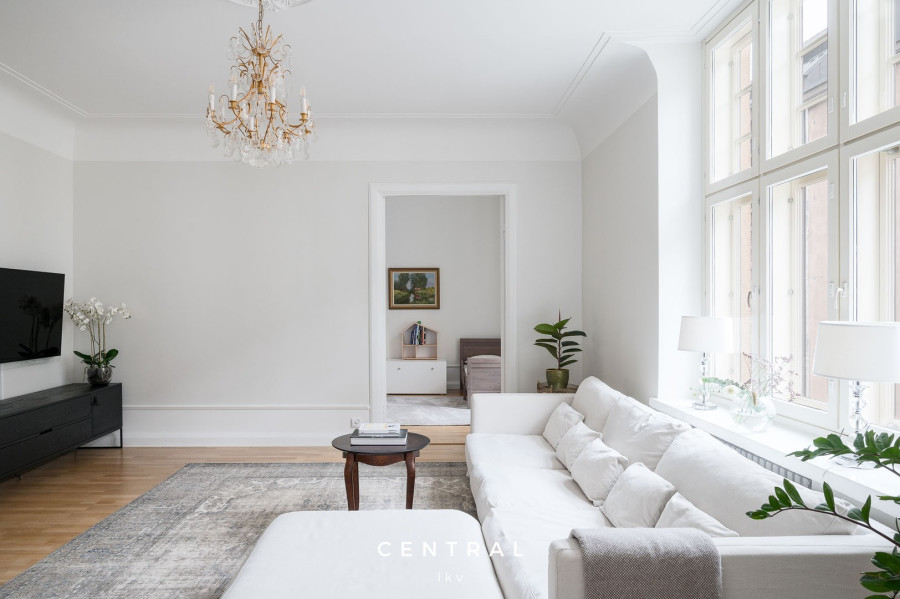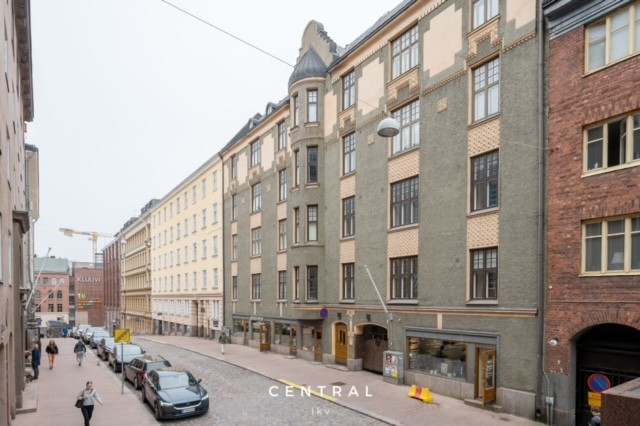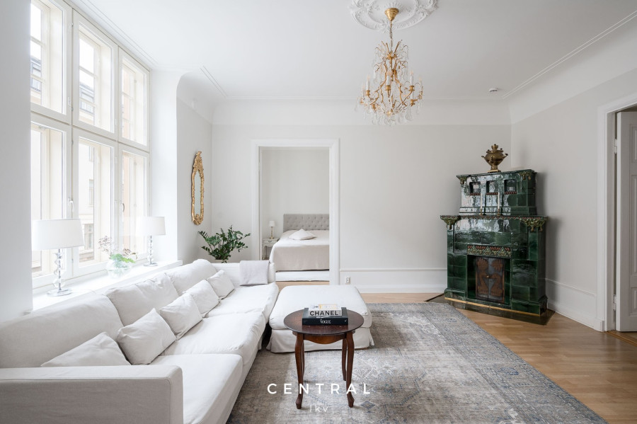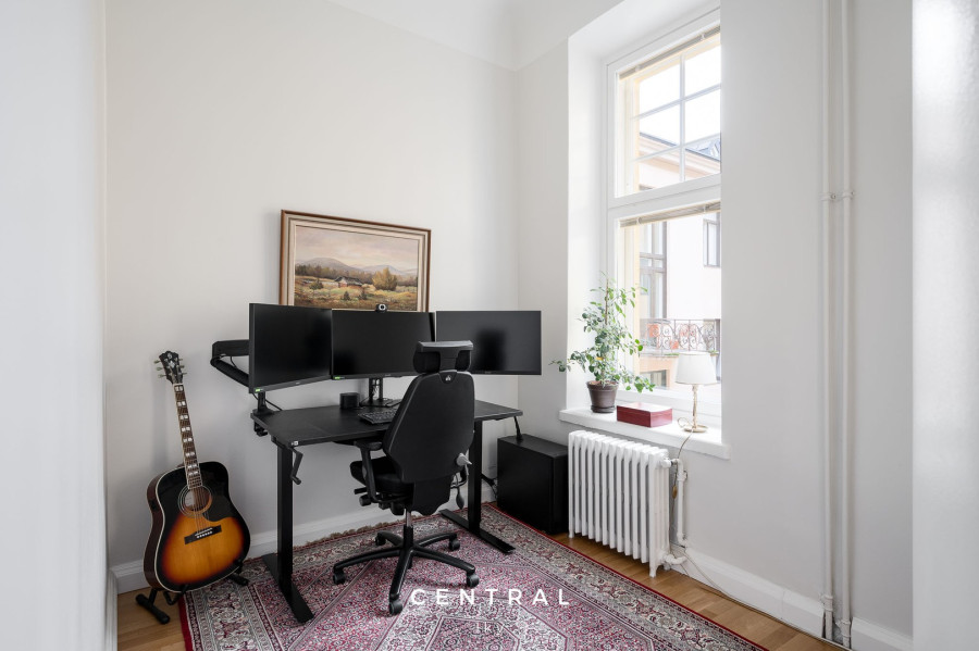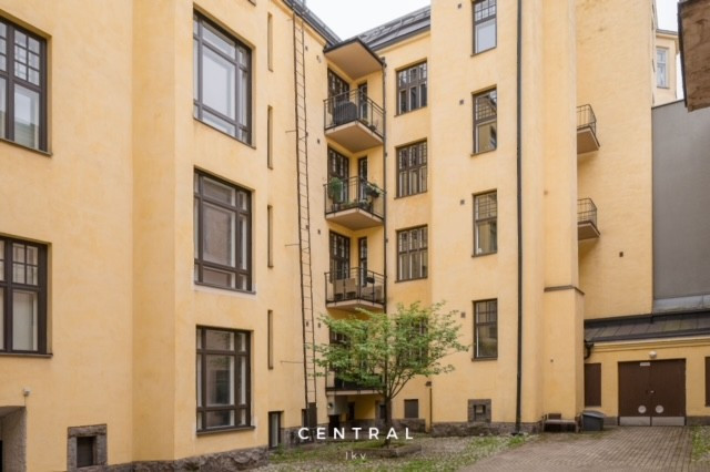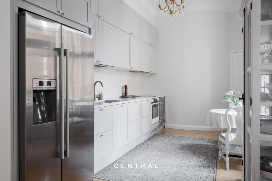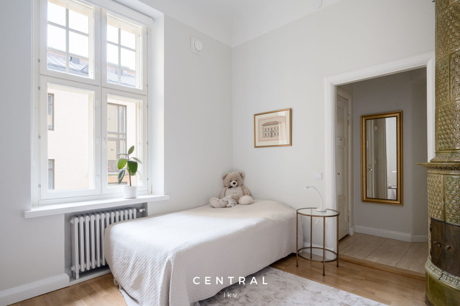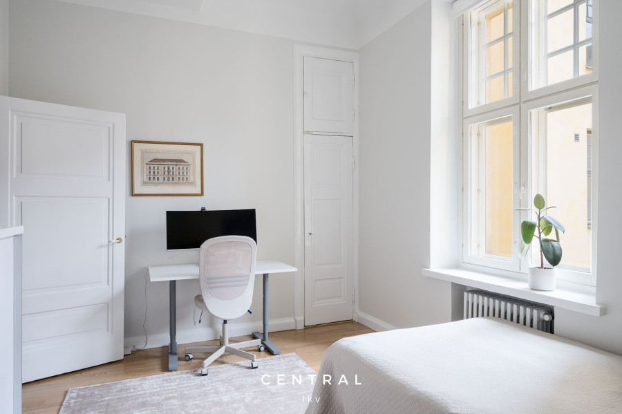 Elegant jugendvåning med imponerande takhöjd, vackra kakelugnar och egen balkong. Klar planlösning med sammanlagt fyra sovrum. Helheten består av två bostadsaktier, varav en 17m2 enrummare som går separera från resten. Denna etta har naturligtvis en egen ingång och fungerar bra som t.ex. ett hemkontor. Här bor du alldeles i Helsingfors kärncentrum men ändå på ett lugnt område. Kort promenadavstånd till järnvägsstationen och för övrigt mångsidigt serviceutbud och trafikförbindelser.