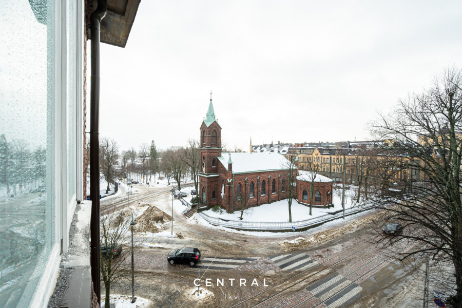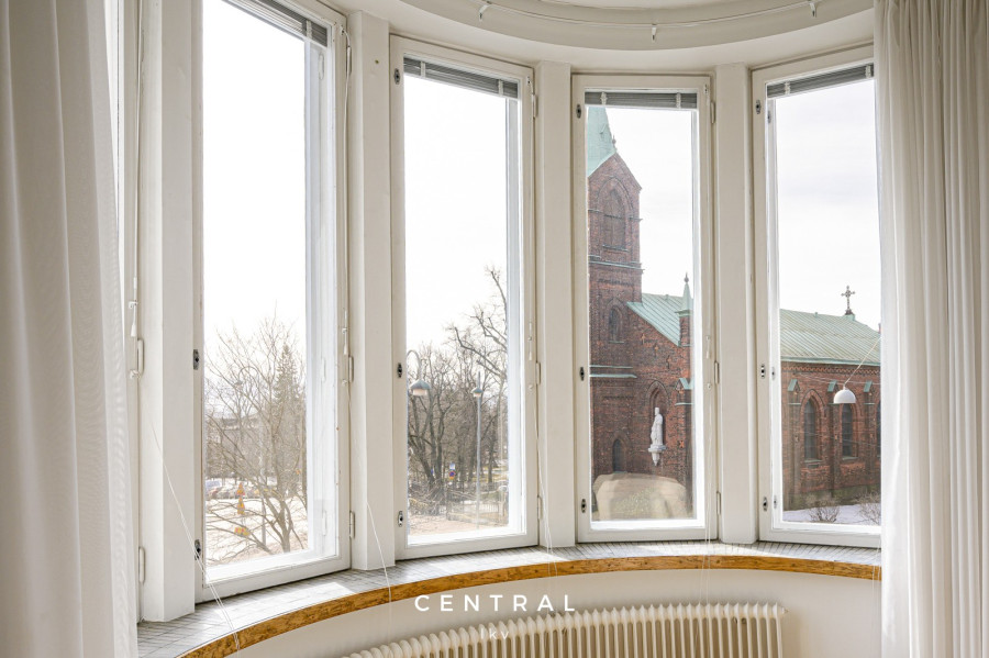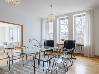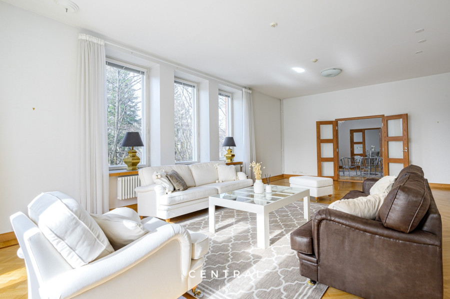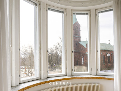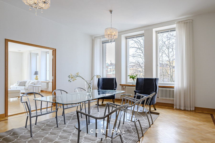 Offered for long term rent an elegant 220 m2 fifth floor flat with beautiful views towards the Kaivopuisto Park. Walking distance to city center, good lokal services and traffic connections, located next to the sea and parks.